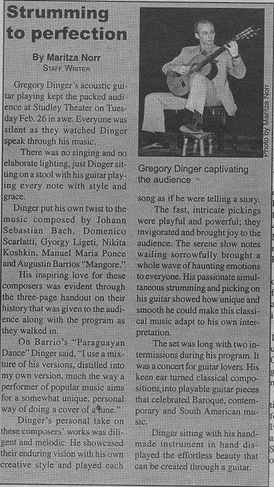 Gregory Dinger’s acoustic guitar playing kept the packed audience at Studley Theater on Tues. Feb. 26 in awe. There was no singing and no elaborate light, just Dinger sitting on a stool with his guitar playing every note with style and grace. His inspiring love for these composers was evident throughout the three-page handout on their history that was given to the audience along with the program as they walked in. He showcased these composers enduring vision with his own creative style and played each song as if he were telling a story. The fast intricate pickings were playful and powerful; they invigorated and brought joy to the audience. The serene slow notes wailing sorrowfully brought a whole wave of hating emotions to everyone. Dinger sitting with his handmade instrument in hand displayed the effortless beauty that can be created through a guitar.”